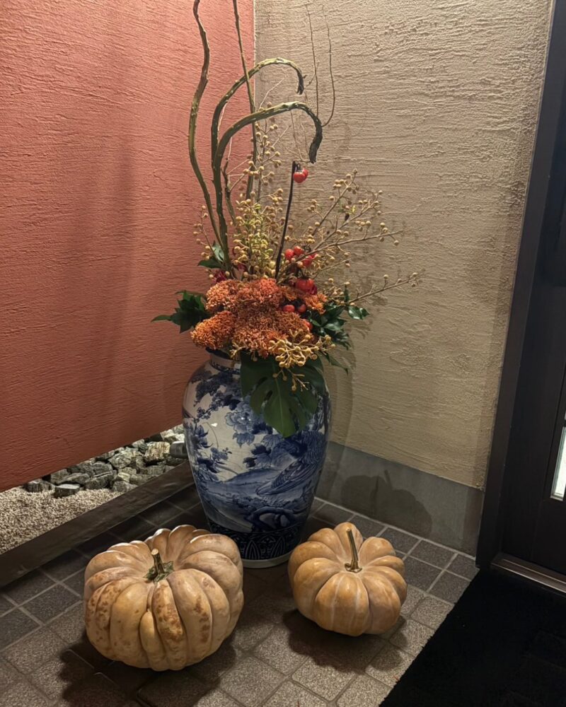秋を感じる花々や紅葉をあしらった花瓶を飾り、